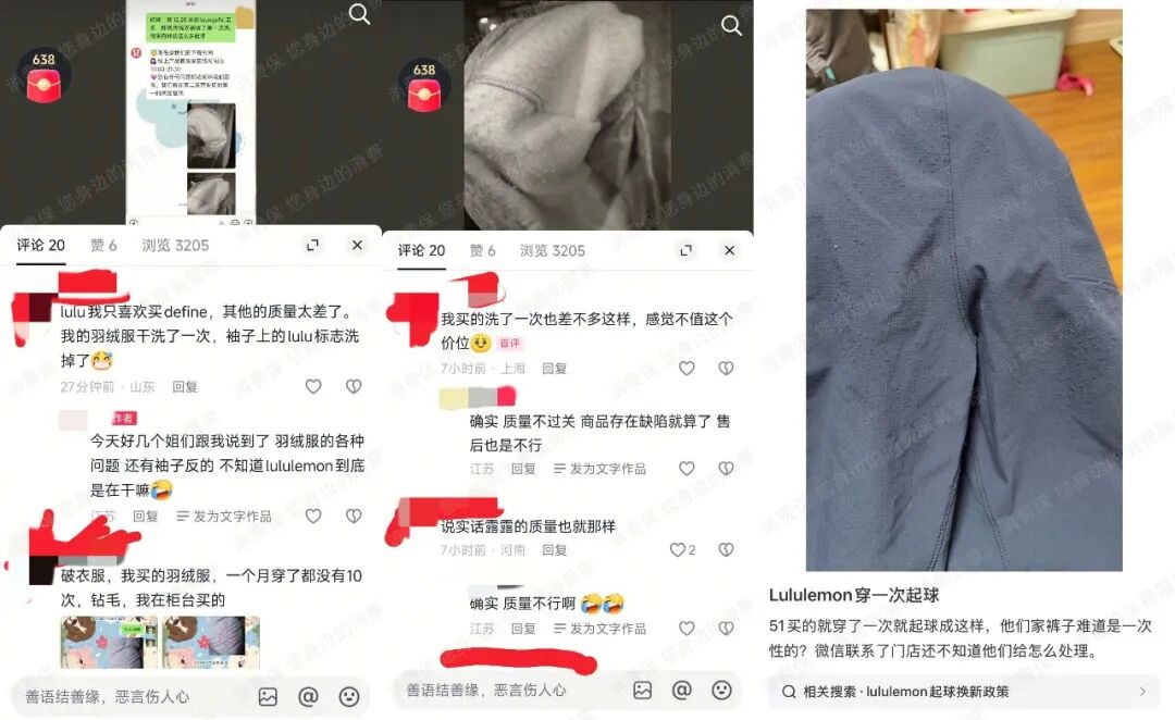 这种审视的目光并非空穴来风。在各大社交平台和消费者投诉平台上,大量消费者反映该品牌衣物面料易起球、勾丝、掉色等质量问题。在消费保投诉平台,Lululemon品牌投诉问题主要集中在产品质量和售后服务两大方面。