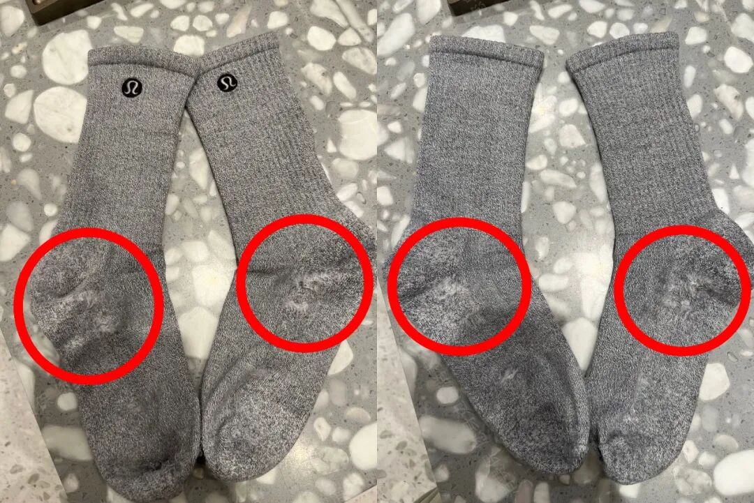 以消费保平台近期的一起投诉为例。消费者钟女士(化名)于3月24日在Lululemon重庆某门店花300元购买了三双运动袜,穿着仅1.5小时后便出现了明显的起球问题。