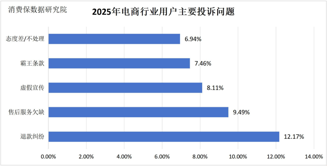 2025年消费保平台数据显示,电商行业全年投诉量达763717件,投诉解决量243,221件,涉及金额11.09亿元,投诉解决率为31.85%。退款纠纷、售后服务欠缺、虚假宣传位列投诉热点前三,其中虚假宣传也是幽灵外卖商家常用手段,与平台资质审核不严直接相关。