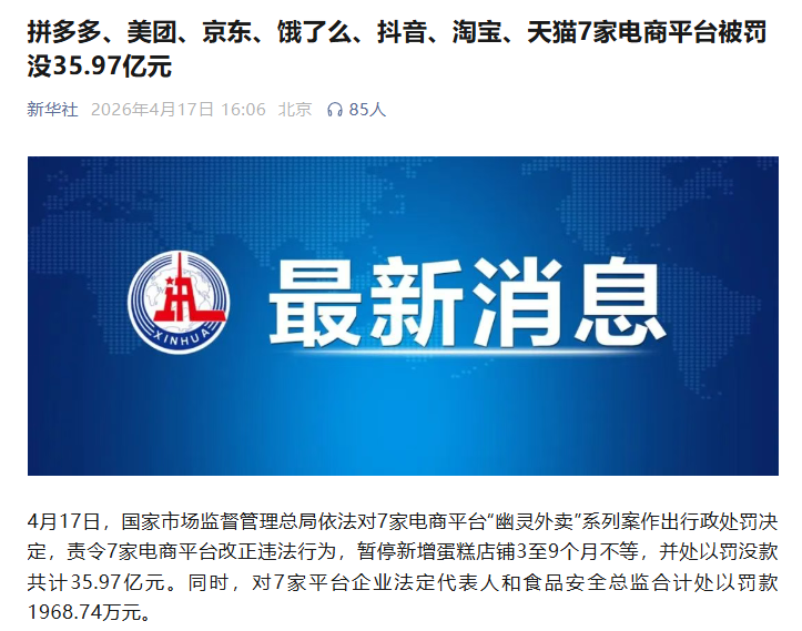 4月17日,国家市场监督管理总局依法对拼多多、美团、京东、饿了么、抖音、淘宝、天猫7家主流电商及外卖平台,就幽灵外卖系列违法案件作出行政处罚,合计罚没款35.97亿元。