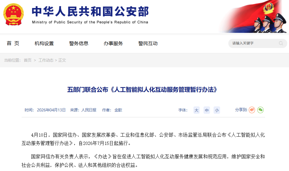 《人工智能拟人化互动服务管理暂行办法》将于2026年7月15日正式施行,明确不得向未成年人提供虚拟伴侣等虚拟亲密关系服务,不得过度迎合用户、诱导情感依赖。