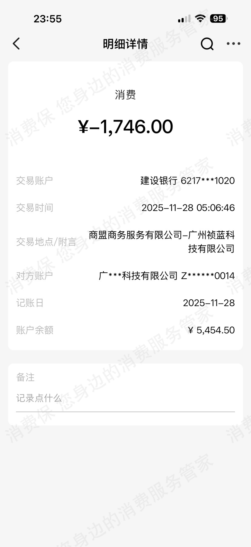 2025年11月28日,商盟商务服务有限公司(现名称为浙江商盟支付有限公司)通过心享优品借款5000元但以购物名义强制向本人出售筋膜*方式扣款砍头息1746元(商盟商务服务有限公司-广州祯蓝科技有限公司),本人签收货物后发现此筋膜*的实际价格只有100左右(淘宝一模一样的商品普遍卖100左右),本人认可贷款利息,不认可这种砍头息,现要求收款人浙江商盟支付有限公司(正扬)立即返还1746元。不然,我将拨打020-123 45民生热线投诉,投诉你们:广州祯蓝科技有限公司,广州市天河区新塘大街3号6栋402房J115。