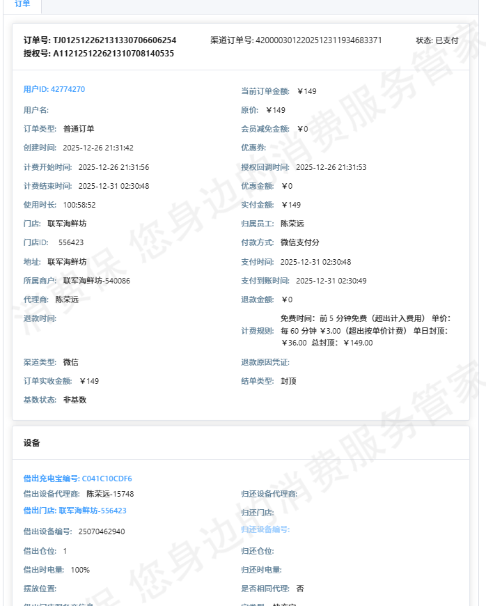 免费时间:前 5 分钟免费(超出计入费用) 单价:每 60 分钟 ¥3.00(超出按单价计费) 单日封顶:¥36.00 总封顶:¥149.00,用户租借的充电宝查询到有归还,订单已累计计费达到总封顶,此单符合计费规则,收到用户的投诉,我司已退回款项146