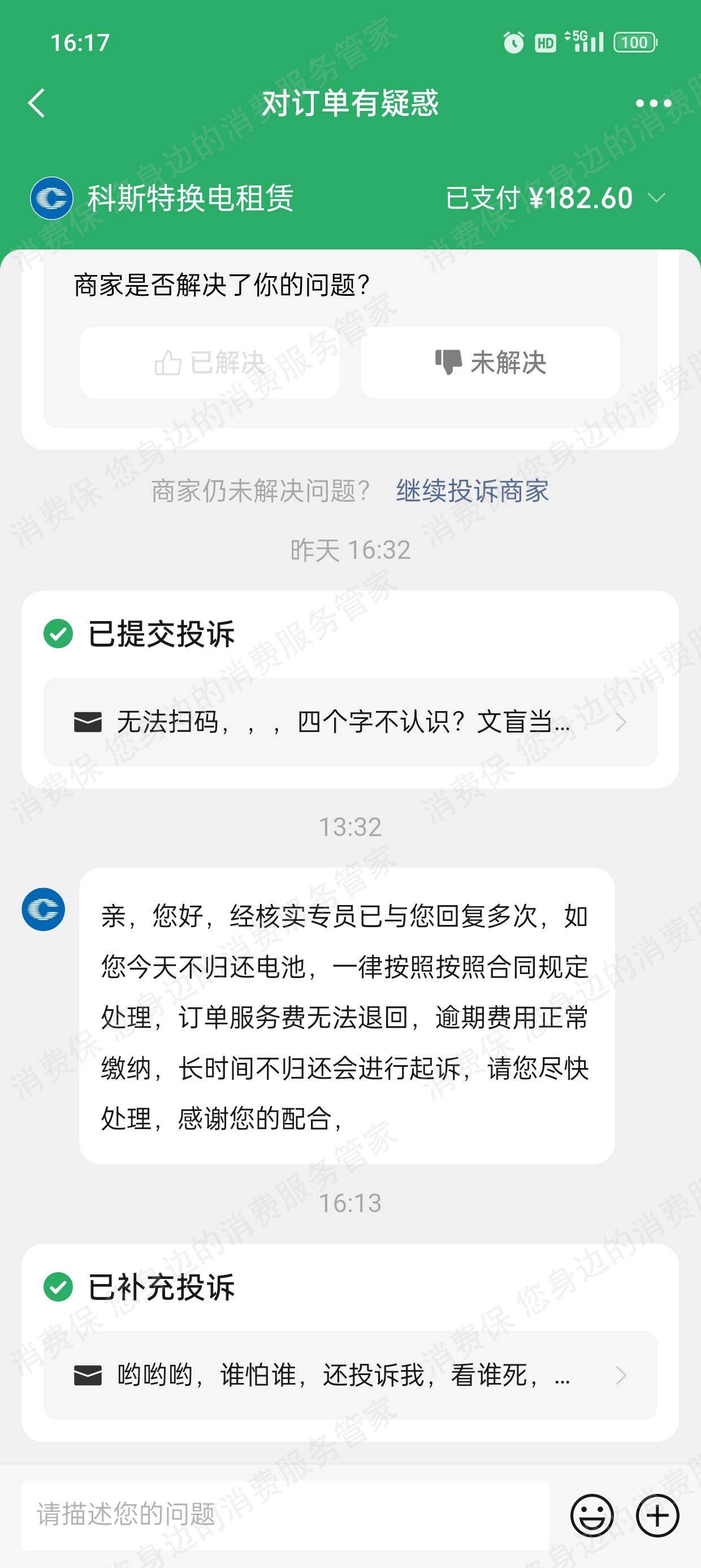 我于2025年12月11日在光宇换电花费220元租借72v35a电池一个(支付订单为图一),但是点进去不知为啥变成两笔分别为182.60元以及37.40元(图二)。 在12月20号之前,电池还可正常使用,12月20号之后无法扫码更换以及扫码退还! 因此我在微信*台进行投诉(图3),光宇换电方一直无所谓,不处理问题,并且一直拿我20号之前的换电记录说事,说我可以正常使用! 微信*台投诉也判光宇换电为责(图4),但目前为止,我并未接到解决问题的电话,只接到客服通知说要我退还电池! 首先, 第一:12月20号之后电池无法扫码正常更换 第二:光宇换电小程序*台地图显示可换电池为2,实际每次跑过去无法扫码更换 第三:包括退还电池,也无法扫码更换 第四:电池当时宣传为可跑80-100公里,实际为50公里左右 第五:电池经常在启动当中突然断电(这里我要求对方出具电池检测合格证明,实在太危险了) 第六:图5及图6图7为小程序评论截图,可见光宇换电对问题的无视以及无视法律法规的态度 中间我也投诉过多次,直至今日,一直为图8的回复 他们每次都是这种回答 最后为证明无法换电视频,我不可能把城市里的每个换电柜都跑一遍,期间我也按照地图显示可换电柜去换,并且是喊朋友开车去的,而且他们没有处理问题的态度,所以只能投诉到这了,还望仔细审核,帮我们底层人民一个忙