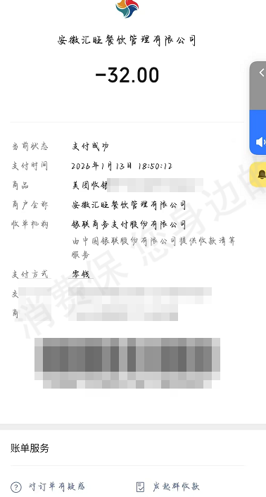 1,根据投诉者上传的付款截图,显示收银系统为:汇来米总收银台,与我司统一使用美团收银系统不同;投诉者上传的收单机构:上海汇付支付有限公司,我司为安徽汇旺餐饮有限公司。