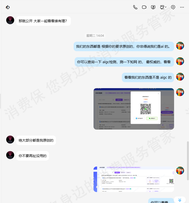 本人于2025年10月31日,在抖音*台的广告诱导下,与商家添加了企业微信。沟通中,一位自称“王老师”的对接人员,声称其团队是由“985博士在职老师”组成,并多次以“原创”“不是造假”“保证质量”等措辞对我进行承诺与保证,当我请求交流进度时,对方均含糊其辞或拒绝,对辅导人员信息隐瞒拒不透露,同时本人也是基于对上海机构(上海信悦瑞果)的信任,但实际确是由沈阳市沈河区玮岳设计工作室负责服务与对接,作为消费者一直处于对方的欺瞒之下。此外,关于沟通对方均以“需要上课”“辅导其他客户”为由含糊应对,从我将原稿件发对方到对方突然告知已完成总计不足一周,在11月17日对方所谓的王老师还在问我原稿和是否只改中期,此时我严重怀疑对方的专业水*和资质问题以及虚假承诺,违法经营。对方存在数据造假,使用AI编造的行为,完全属于学术不端虚假辅导。恳请相关部门介入调查,监督无良商家全额退款18000元。