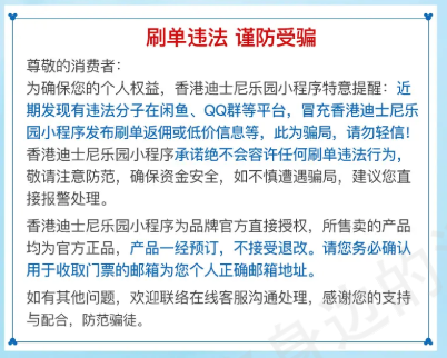 您好,香港迪士尼乐园官方授权小程序商城一直遵纪守法合法经营。我们店铺不会通过闲鱼、QQ、微信、旺旺等任何途径任何方式要求客人刷单(换取其他乐园产品门票及酒店)。如果您不慎遭遇违法*局,我们建议您提供详细信息及相关截图信息直接联系客服反馈。如您已报警处理,有需要的话,店铺也会积极配合警方的。但店铺也再次提醒,本店铺承诺不会以任何形式要求客人刷单的违法行为,请注意防范,确保资金安全哦。