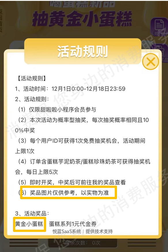 甜啦啦虚假宣传黄金奖品品牌不符