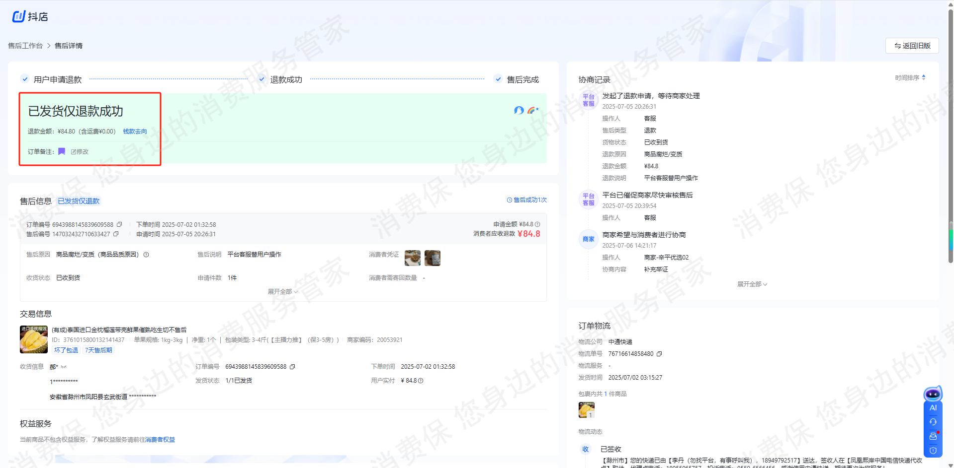 抖音商城榴莲质量问题及退款纠纷