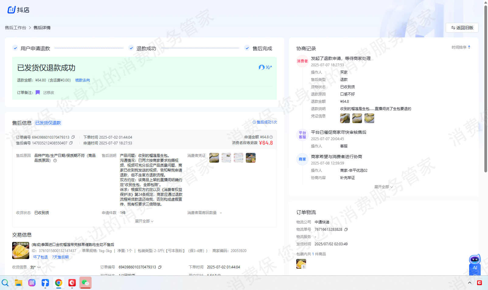 1.基本情况:我于7月2日在抖音*台“中天智慧农业生鲜店有成”直播间购买其上架的,“壹品慧水果蔬菜专营店”销售的榴莲,7月4日签收货物,签收货物后与商家沟通过何时开果,于7月7日开果,打开后发现是“生包”,并立即向商家反馈。 2.产品问题:收到的榴莲是生包。 3.沟通情况:已两次按商家要求拍摄视频,视频可充分反应产品质量问题,商家已收到我发送的视频,告知帮我申请退款,但不走官方退款流程。 4.双方约定:该商品上架的直播间明确约定“收到生包,全部包赔”。 5.证据链:该直播间*期公示的直播记录能显示上架产品,就有我购买的商家产品➕直播间告知“生包包赔”➕我发送视频后,店家反馈帮申请退款——构成完整证据链 6.诉求:根据双方约定以及《消费者权益保护法》第24条规定,商家应通过退款流程将货款退还给我,否则构成虚假宣传,我有权要求三倍赔偿。 目前,商家明知产品存在问题,但是硬性要求我取消退货流程,此外没有任何回复,还让我一直上传凭证(增加商家处理时间),搞拖延战术,请严肃、尽快处理我的投诉!