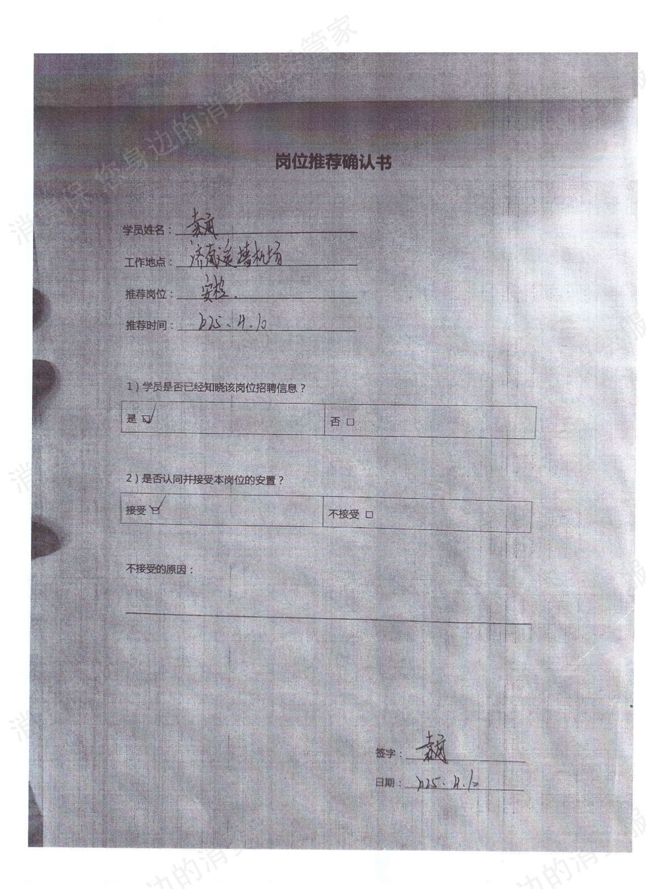 该学员已进入济南机场安检岗位,公司工作人员也与学员沟通并发送其他岗位信息