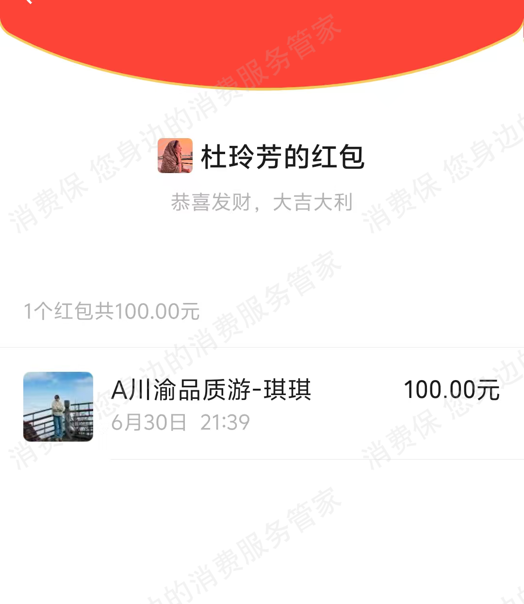 2025.6.30在小红书加了一个四川导游微信。沟通报团旅游的事情,让交100元定金,说锁定个什么优惠,后期不报团了也可以随时退。但后来我们没抱这种大团,找了一个私人品质小团玩的。跟这个导游沟通退定金的事情就一直拖延。8月5日回复说第二天财务给退,至今也没收到。现在微信不回,电话不接。财务收据盖的章是四川省中国国际旅行社有限责任公司成华六分社。微信名是A川渝品质游琪琪。希望这个公司尽快帮我找到这个导游退还我的100元。