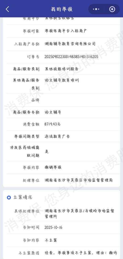 我于2025年9月1日在小红书上看到此机构的论文辅导宣传,信以为真,加企业微信了解后付定金人民币8720元,期间本人未使用对方提供的任何所谓的辅导,昨日有所怀疑点开微信,发现此人朋友圈内容消失,微信消息不回复,意识到被诈*。
