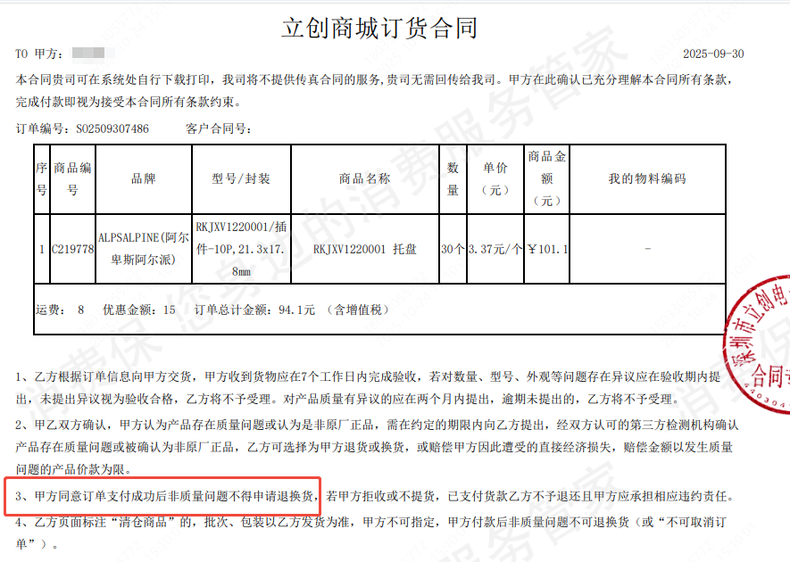 9月30日在立创商城购买了一批多功能摇杆,10月3日收货发现摇杆型号购买错误,商城有2款摇杆实在相似。10月4日联系客服告知无法退换,我提出承担发货退货费用也不予退换,立创的合同都是自动生成的,之前下单从未注意过立创会在合同中加入不可退货的霸王条款