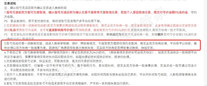 尊敬的螃蟹游戏服务网用户您好,经核实当前交易阶段已到达换绑挂IP阶段,现阶段双方均无法单方面取消交易,违约方可以通过违约金的形式进行协商。平台无法强制违约金的金额,以双方协商为准,可以通过交易刚开始前发送的交易须知进行查看,或通过官网首页的交易须知查看。