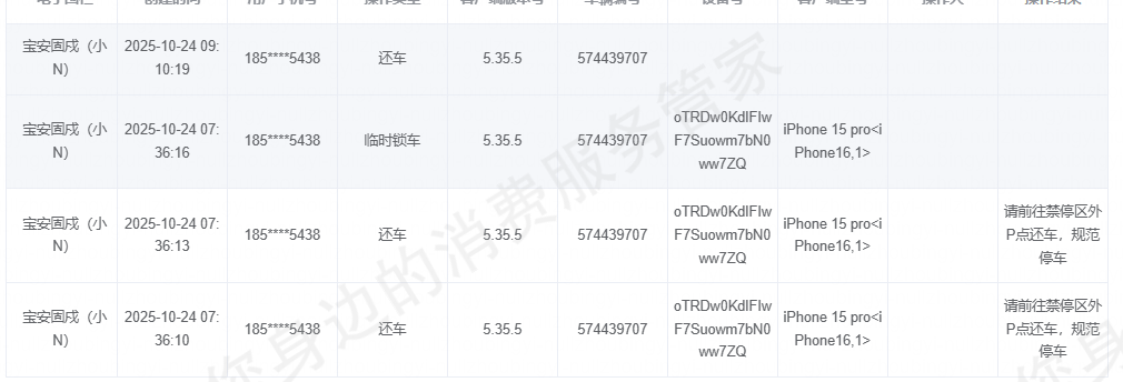 企业收到反馈后,多次致电投诉人均未接听电话。核实您在2025-10-24 07:31:56开锁车辆,停放位置是小遛禁停区。您当时操作还车提示:请前往禁停区外P点还车,规范停车。但您未骑行至还车点,最后长时间停放系统还车,小遛按照时长计费,未还车是在持续计费的。费用需要自行承担