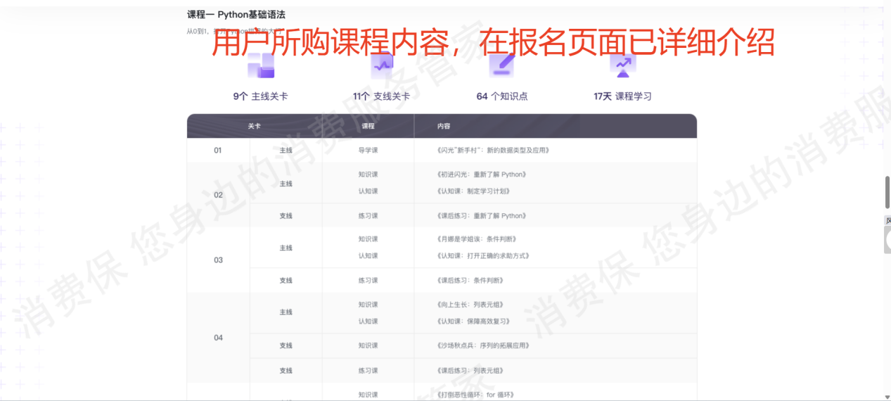 2.用户2024年5月23日购买我司AI成长计划网络课程,课程内容与Python课程一样,在报名页面均有展示,并且用户付费后我司也已为其开通课程学*资格,用户可自行登录学*网址查询课程,若认为哪一点与宣传不符,可以及时向我司反馈。