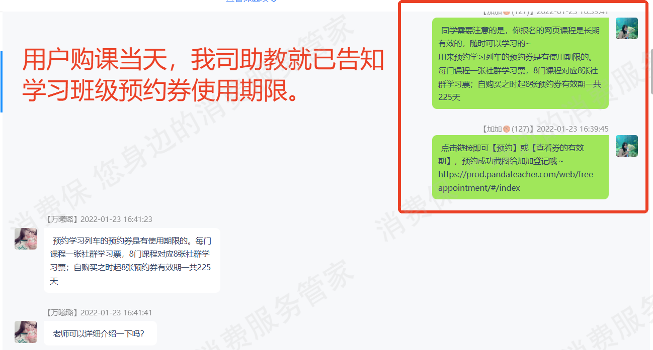 并且在用户购买课程时我司助教就已告知了用户学*班级预约券有效期,也已提醒用户需要及时预约班级学*。