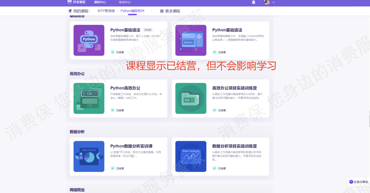 3.用户所购Python课程属于自主预约班级的学*模式,在用户购课后,我司会在其学*账号上发放学*班级预约券,因学*班级涉及到助教服务,需要我司提供人力成本,因此会在用户购课后设置学*班级预约券使用期限,若用户未再预约券有效期内预约课程,则课程会提示已结营,但用户所购课程网页课长期可以学*,即使已结营也不会影响用户课程学*。