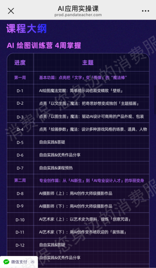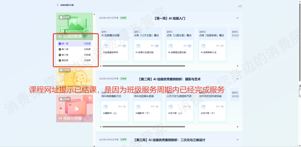 4.用户所购AI课程学*班级由我司助教分配,一般是在用户购课后的次周开班,用户2024年5月23日购课,学*营于2024年5月27日开班,课程开班后我司会逐周向用户开放每周的课程学*内容,课程共计8周,每周解锁一部分,8周服务期结束后会提示课程已结营,但仍旧不会影响用户课程学*,用户登录学*网址后可以点击任意关卡进行学*。