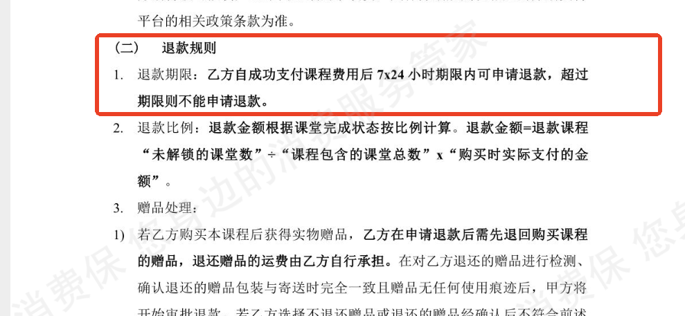 5.用户所购Python课程以及AI课程退款规则均已于售前明示,支持付费后7*24小时内按照学*比例退款,超出期限无法申请,用户分别于2022年1月23日以及2024年5月23日购课,用户购课后也已签署我司购课协议,退款规则在协议中也有说明,目前用户所购课程已超出我司规定退款期限,不符合我司退款条件,无法满足用户退费诉求。