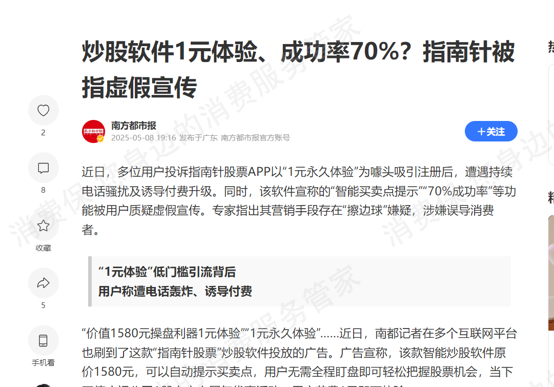 南方都市报曾在2025年5月8号报导过 指南针股票app以“1元永久体验”为噱头吸引注册后,遭遇持续电话骚扰及诱导付费升级。同时,该软件宣称的“智能买卖点提示”“70%成功率”等功能被用户质疑虚假宣传。专家指出其营销手段存在“擦边球”嫌疑,涉嫌误导消费者。