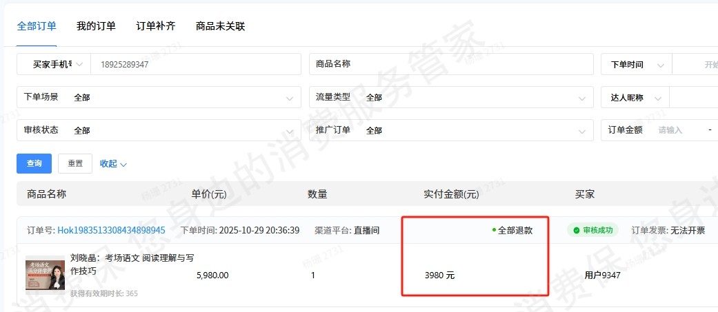 本人于2025年10月29日买了播客文化的晓晶老师的语文直播课3980元,当天咨询客服直播课是否适合所以年级的小孩,客服回答是的,我再问试听后不合适是否可以退款,客服回答是的,课程在11月4日开播,我听了以后发现不符合我家孩子年龄,在11月6日申请退款,客服说一周内会收到退款,但一直没有,再咨询客服就没有回应了,商家存在夸大宣传,敷衍客户,恶意拖延退款,不肯提供公司联系方式,纯属欺诈,现投诉商家,并要求按承诺的全额退款!