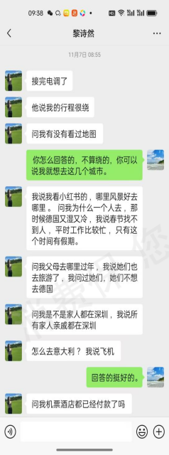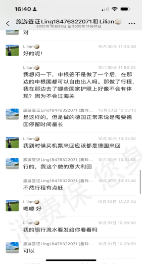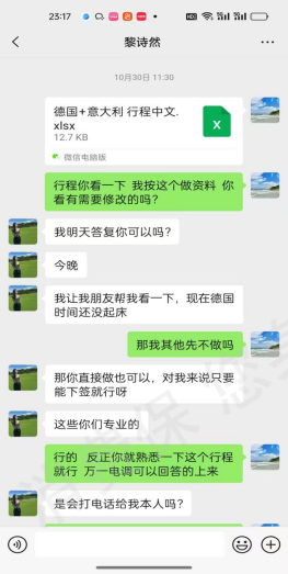2、我们提供的行程是发给客人确认过了,并没有提出任何需要修改的意见。如客人对话所说她有朋友熟悉德国,这个行程是客人跟朋友都看过没有问题的。10月30日10点31分说晚上给答复。10月31日1点31分跟客服最后落实了行程后回复了好。所以就默认客人同意按这个行程来递交(见附件二),而且我们的行程没有绕,是一个正常的德国和意大利的旅程,行程是否绕是一个很主观的问题,每个人想法跟规划都不一样。