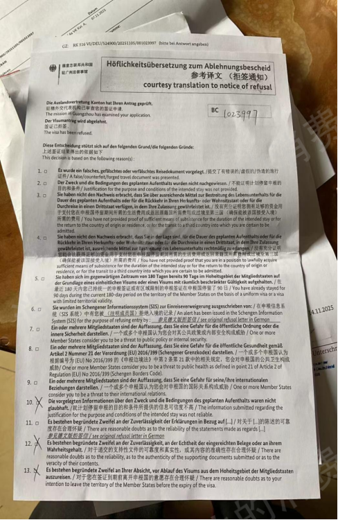 1、拒签信上并没有提到是由于行程的原因拒签,是对客人入境目的存疑。(见附件一)因为德国是比较特殊的,德国一般是商务客人居多,旅游客人少。领馆对客人电调的时候也说问了客人公司做什么,会去哪些*比赛;问客人为什么一个人在又湿又冷的2月去德国旅游。以上问题显然佐证了客人拒签原因是怀疑入境目的不是去旅游可能是去商务等行为。