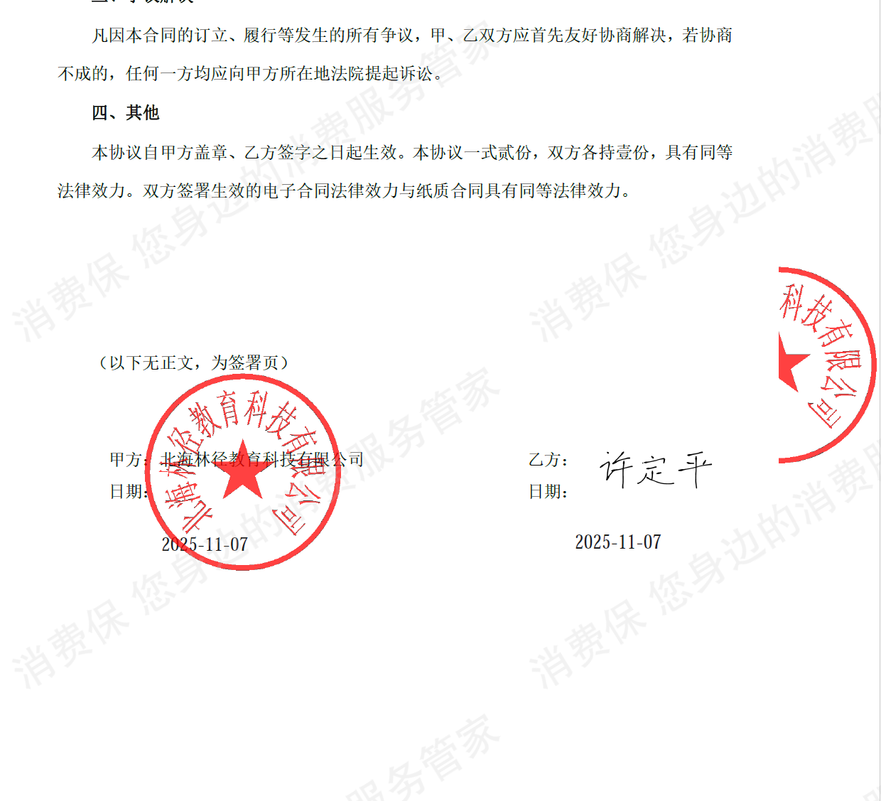 我于2024年7月和12月在北京花径教育咨询有限公司诱*下,与北海林径教育科技有限公司签订了两份合同,支付了112600元购买网课。 1 合同上全是霸王条款并且侵权,声称学员本人所写的心得的知识产权属于甲方。 2 合同上甲方名称与地址不符,存在欺*行为。 3 合同注明甲方委托给重庆花径心理咨询服务有限公司就合同的签署、履行、执行、通知和送达等事项提供统一管理服务,而重庆公司并无经营实体,只是空壳,由此故意设置管辖障碍,提高消费者维权难度。 4 北京、北海、重庆三个公司均无教育培训资质,也没有心理咨询培训资质,但是却在违规经营这两项业务。 5 课程内容包含有害内容、精神控制、洗脑等。 因此我要求撤销合同并退还全部学费。